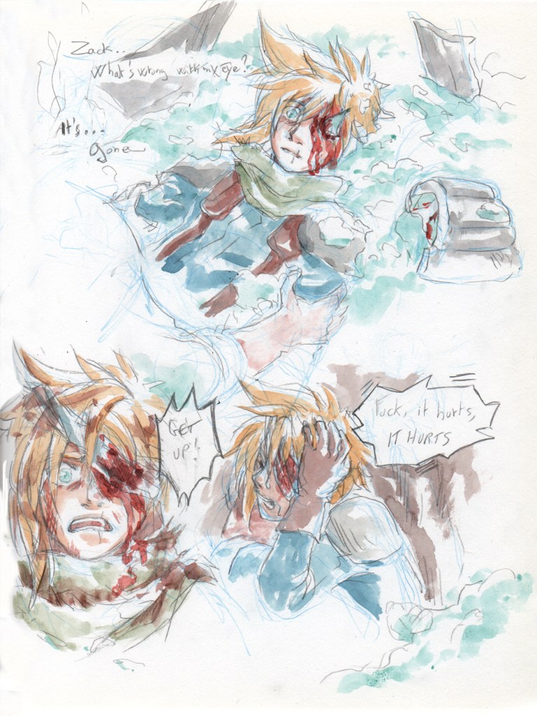 Si je devais synthétiser cette fic : Une pluie de angst, les perso prennent toujours plus cher, ils peuvent jamais se reposer, leur vie est pourrie, j’adore. Y’a toute un aspect scénarisé très cool aussi qu’on retrouve pas forcement dans ce genre de fics. L’histoire débute avec Zack qui crush sur Cloud, puis se retrouve en mission avec lui (cool) mais leur avion crashent et ils sont dans une grosse merde dans la neige (moins cool) ils survivent et quand ils trouvent un hangar ou s’abriter Cloud avoue à Zack que cette mission était en réalité une mission pour le tuer lui, sur ordre de Sephiroth…